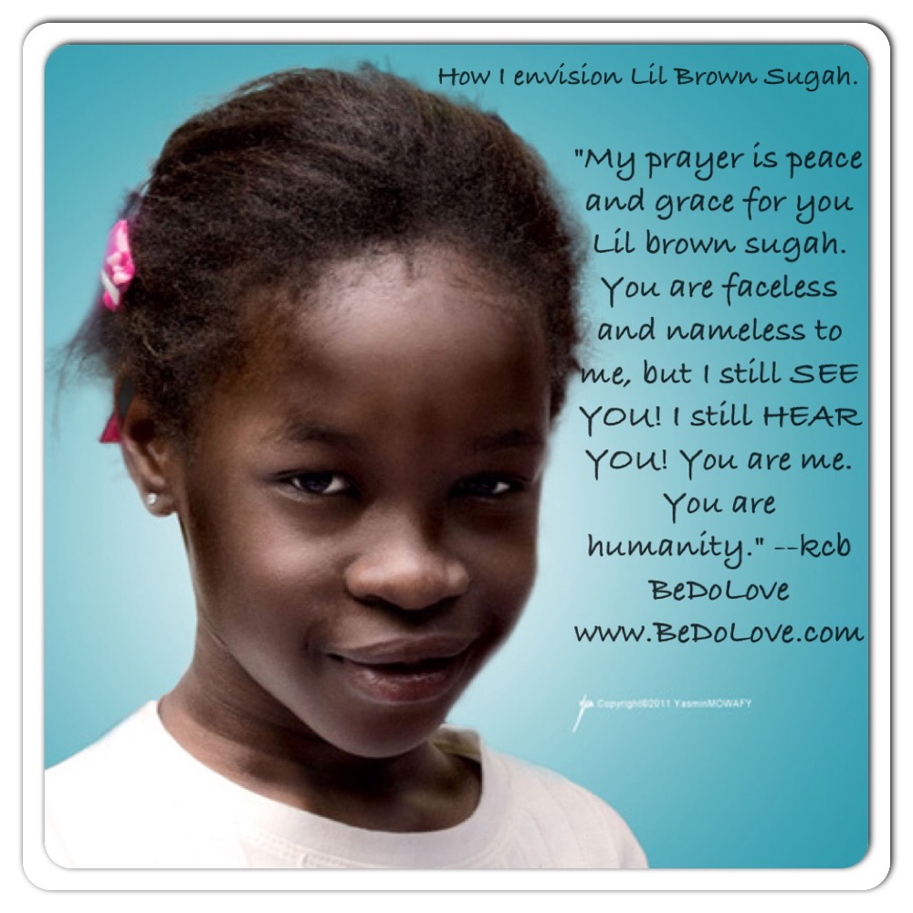 Lil brown sugah, I pray you will find the will to LIVE, TRUST, HOPE, BELIEVE, and LOVE! That you will have the unconditional love and support of a nurturing village, full of compassion and patience. That your recent stunted growth will be for a short time only to be birthed with wisdom and an abundance of love. And, that you Lil brown sugah, you will BLOOOOOM like a radiant flower. That you Lil brown sugah will BECOME the BEAUTIFUL and VIBRANT butterfly SOARING and BEING all you were destined to be before you were even birthed into this promising yet confusing world.