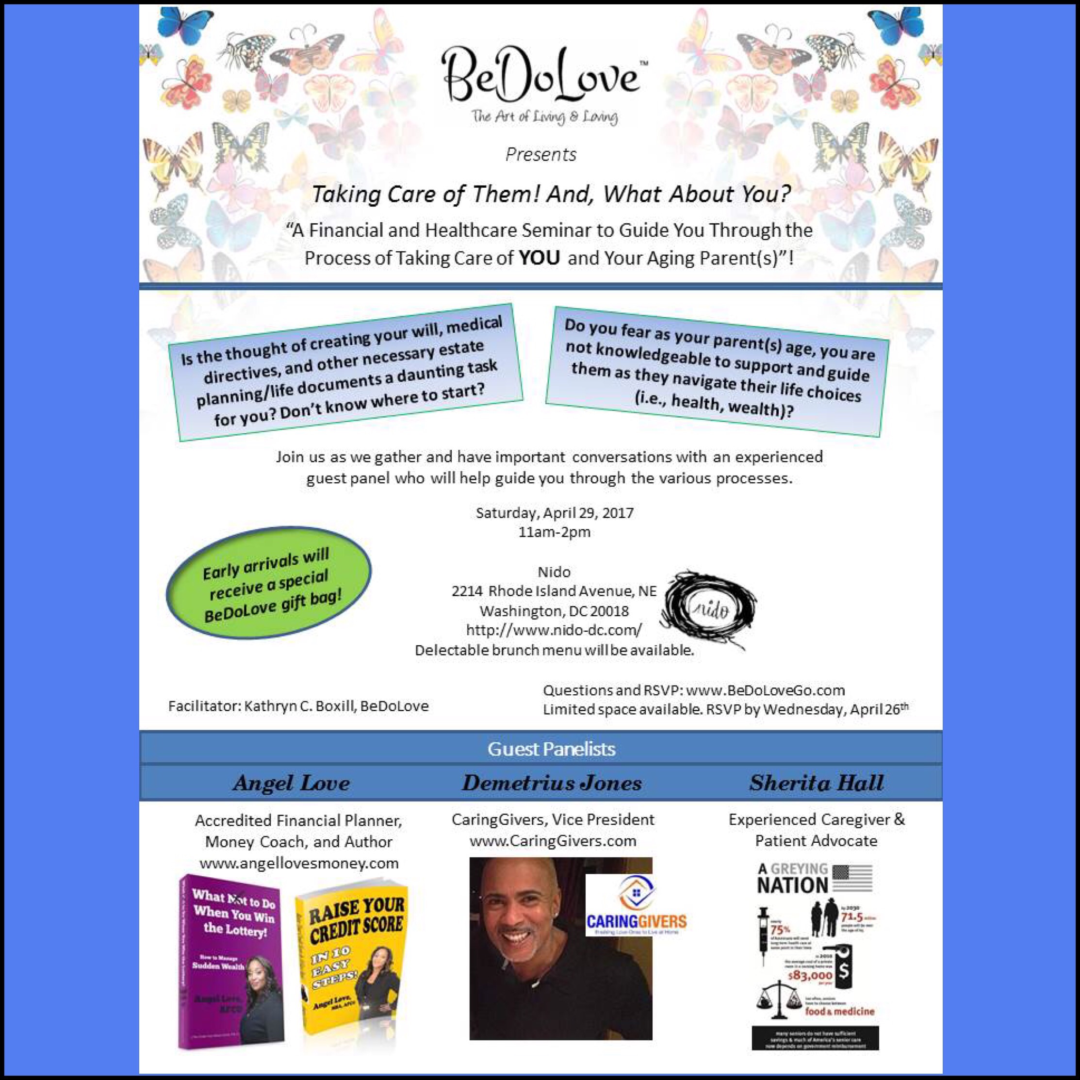 BeDoLove invites you to “Taking Care of Them! And, What About You? – A Financial and Healthcare Seminar to Guide You Through the Process of Taking Care of YOU and Your Aging Parent(s)”!