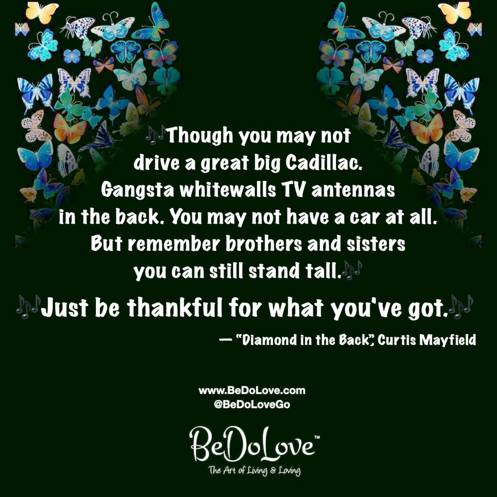 🎶Though you may not drive a great big Cadillac. Gangsta whitewalls TV antennas in the back. You may not have a car at all. But remember brothers and sisters. You can still stand tall. Just be thankful for what you’ve got.🎶 In “Diamond in the Back”, Curtis Mayfield so eloquently and smoothly preached about being cool in your own skin. Releasing jealously and shame by having self-worth. (Ole school grooving at its finest. https://youtu.be/ZVANQheoRUw)
