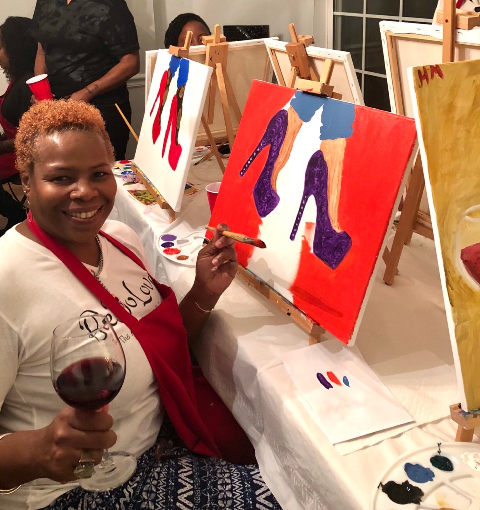 At the designated time and after some important sipping, I took my position at my station. The creative juices began flowing with each thought of color complimenting selections. What color for my shoes? How can I make the shoes pop based on the background color? This process attracted and elevated the Kathryn, who loves and knows what she likes, but welcomes being open to the colorful palettes of life. With each stroke of paint to canvas, I was consciously and subconsciously reminded to be present and not allow myself to be consumed by the heaviness of life. With each stroke of paint to canvas, the energy flowed from the canvas through my fingers to my wanting to be loved up on heart. Me exhaling what doesn’t serve me and inhaling calm, healing, peace, joy, confidence, and fun.