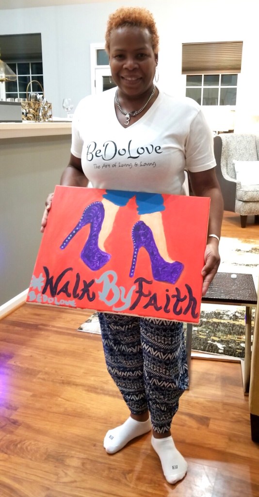 The moment I walked into Cat’s beautiful home and laid my eyes on the nearly 20 stations set up with easels, aprons, brushes, and canvases, my spirit said “YIPPPPEEEE”! We had two projects to choose from. They were “Wine for Two” or “Walk by Faith”. Spirit led me to “Walk by Faith”. Faith being a necessary DNA component of my life. Especially now. It’s about believing. It’s about an all-knowing that ALL things are possible. Especially those that speak through the soul pertaining to passion and purpose. I remember a quote from Robin Roberts that says “When fear knocks, let faith open the door.” As an homage to the wine project and removing fear, I indulged by sipping on a tasty Red Zinfindel. My creative juices thanked me. (hiccup) However, presencing faith was the order of the night.