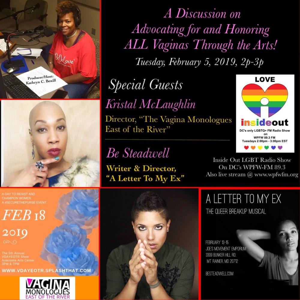 Please tune into INSIDE OUT LGBT RADIO SHOW today, Tuesday, February 5, 2019, 2pm-3pm EST as we discuss the topic of “Advocating for and Honoring ALL Vaginas Through the Arts.” We will engage in the topic of the upcoming theatre performances of the “The Vagina Monologues East of the River” (Director, Kristal McLaughlin) and “A Letter to My Ex” (Writer & Director, Be Steadwell) and the importance of advocating for and empowering women through opportunities to embrace who they are and having a voice. I’m excited to have these two amazing artists and vagina warriors for what will be an engaging, informative and fun conversation.
