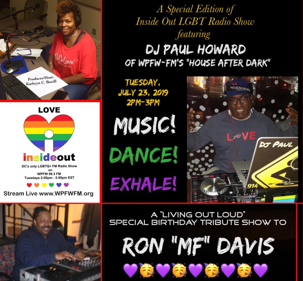 Please join me and my special guest DJ Paul Howard of “House After Dark” as we create magical musical birthday vibes in honor of our dopest of dope ancestor’s Ron. Baby powder glide in on WPFW-FM’s “INSIDE OUT LGBT RADIO Show” today, Tuesday, July 23, 2019 from 2pm-3pm EST. Tune in from the DMV at 89.3 FM or stream live ANYWHERE from your computer, phone or tablet at www.wpfwfm.org.