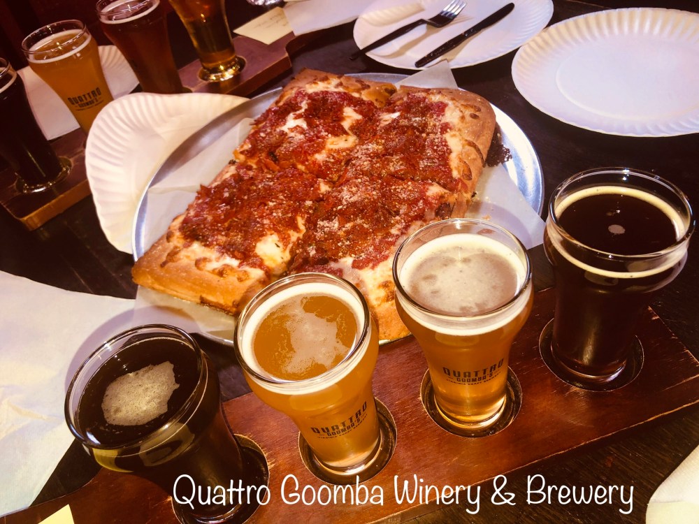 We 1st visited the Quattro Goomba’s (Meaning 4 friends. Which are the 4 friends who opened the spot.) Winery & Brewery. Came for the wine tasting (which was a nice selection), beer, and the much heard about Sicilian pizza which was sooooo delish. Not so CAAAARRRBBBISH feeling. Light crust. And, the beer flight I perfectly curated with Dark Cherry (chocolate, cherry, milk stout), Resistance (mango & Passionfruit wheat), infatuation (pumpkin spice saison), and Winter (Belgian quad).