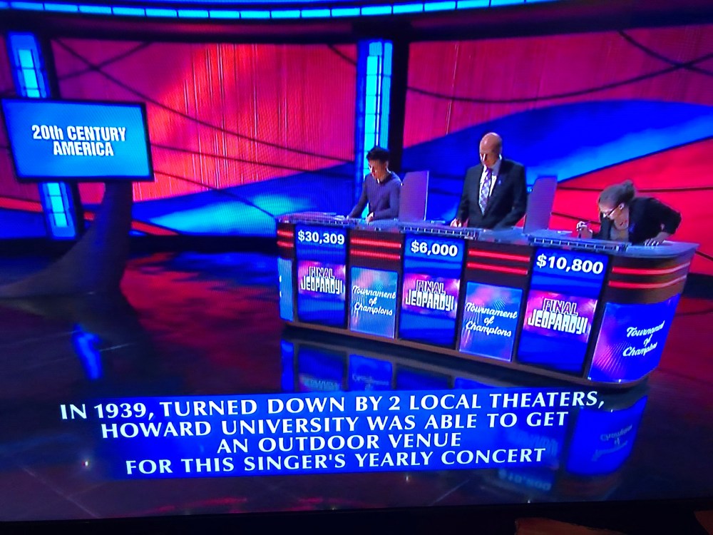 “In 1939, turned down by 2 local theaters, Howard University was able to get an outdoor venue for this singer’s yearly concert.” Alex, Who is Marian Anderson (Jeopardy James is at it again.). https://youtu.be/G3EUGgTWwnQ