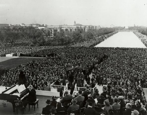 According to Wikipedia: “In 1939, the Daughters of the American Revolution (DAR) refused permission for Anderson to sing to an integrated audience in Constitution Hall in Washington, DC. The incident placed Anderson into the spotlight of the international community on a level unusual for a classical musician. With the aid of First Lady Eleanor Roosevelt and her husband Franklin D. Roosevelt, Anderson performed a critically acclaimed open-air concert on Easter Sunday, April 9, 1939, on the steps of the Lincoln Memorial in the capital. She sang before an integrated crowd of more than 75,000 people and a radio audience in the millions.” https://en.m.wikipedia.org/wiki/Marian_Anderson