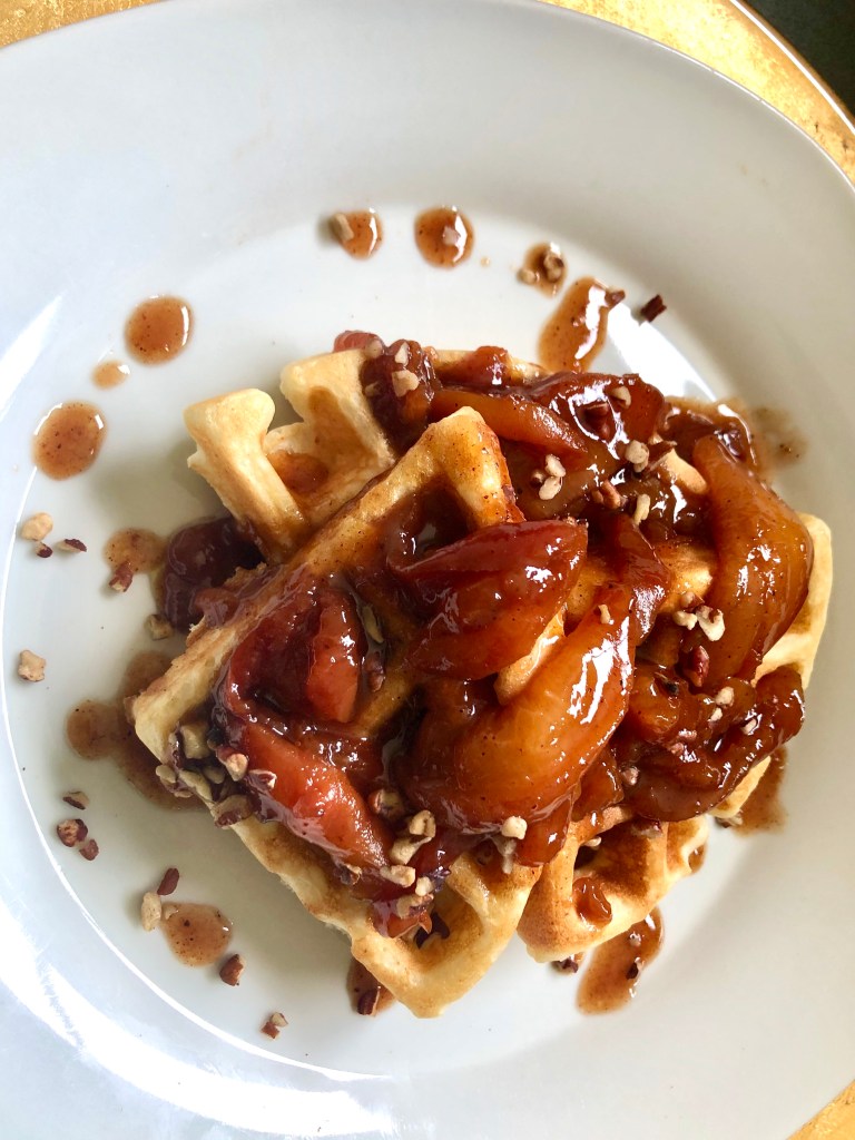 -Almond Ricotta Waffles topped with Bourbon Peaches & Pecans