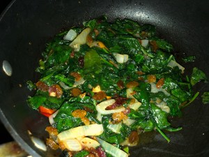 The main course was accompanied by Spinach w/Golden Raisins, Shitake Mushrooms, Onions, etc. – One of my signature dishes, which I love for its sweet and savory spin.