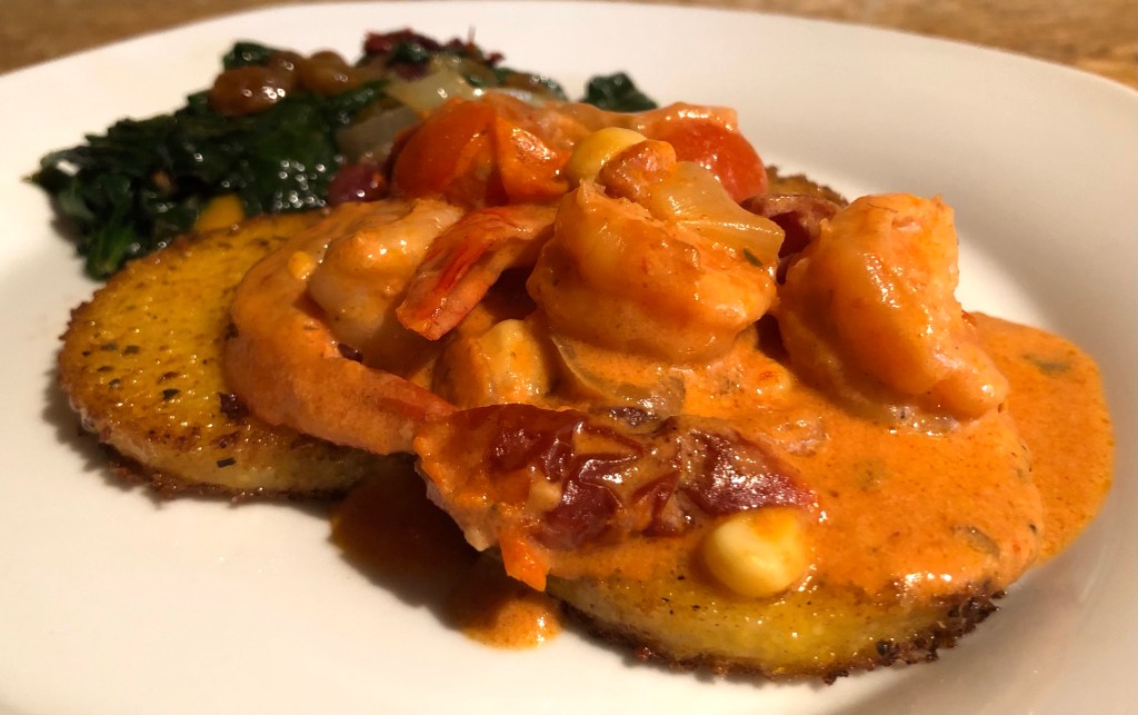 I’ve always wanted to prepare a dish with polenta. I finally purchased some brainstorming on my first dish with lamb. Well, I had a bag of shrimp in the freezer and voila. We have a spin on Shrimp & Grits instead with Polenta Cakes. The shrimp is made with Cajun seasoning (Slap Yo Mama and others), onions, bell peppers, shiitake mushrooms, tomatoes, sun-dried tomatoes, garlic, bacon mmm…, half & half, tomato paste, and Parmesan cheese. It may have more ish… 🤷🏽♀️
