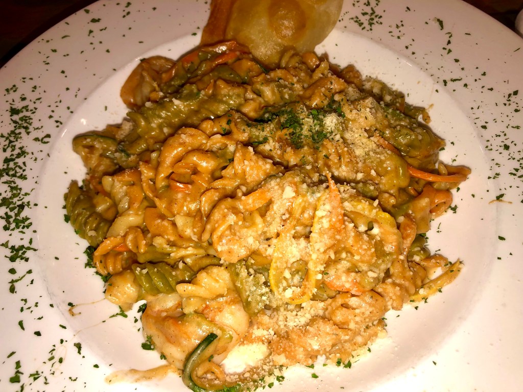 ~Rasta Pasta – Tricolor Rotini, Shrimp, Sautéed Vegetables, Herb Coconut Cream Sauce