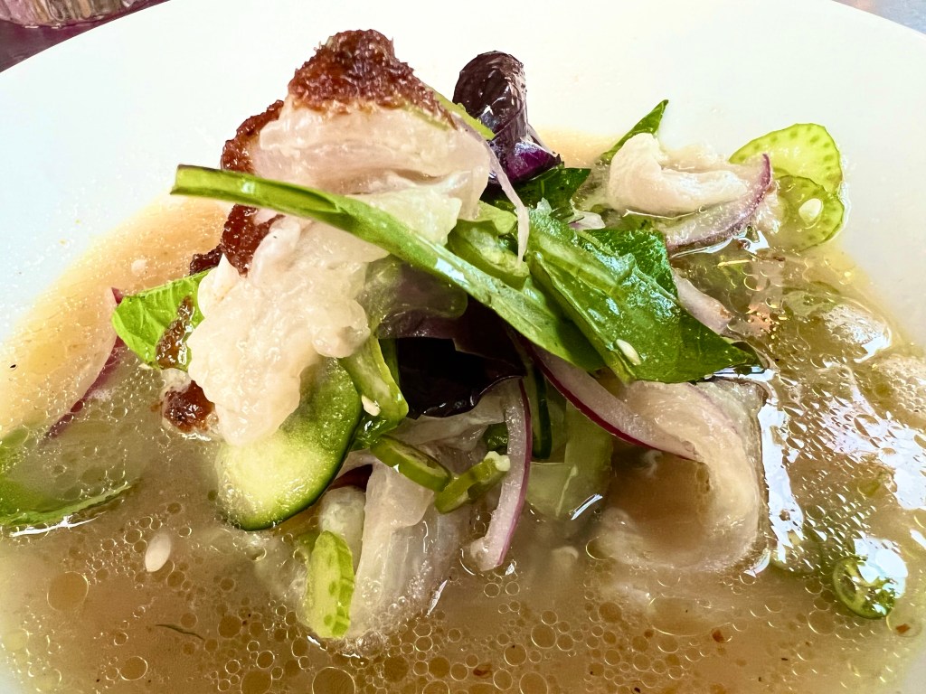 ~CEVICHE DE QUELITES – Snapper, Fermented Pineapple, Capache???, Herbs, Mango Chile Oil